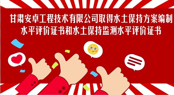甘肅安卓工程技術(shù)有限公司根據(jù)相關(guān)文件和辦法申請參加了2018年度水土保持方案編制和水土保持監(jiān)測水平評價(jià)證書申報(bào)工作。近日,中國水保學(xué)會公布了評審結(jié)果,我公司順利獲得水土保持方案編制水平評價(jià)證書和水土保持監(jiān)測水平評價(jià)證書。水平評價(jià)證書是對我公司水保技術(shù)實(shí)力的認(rèn)可和肯定。
